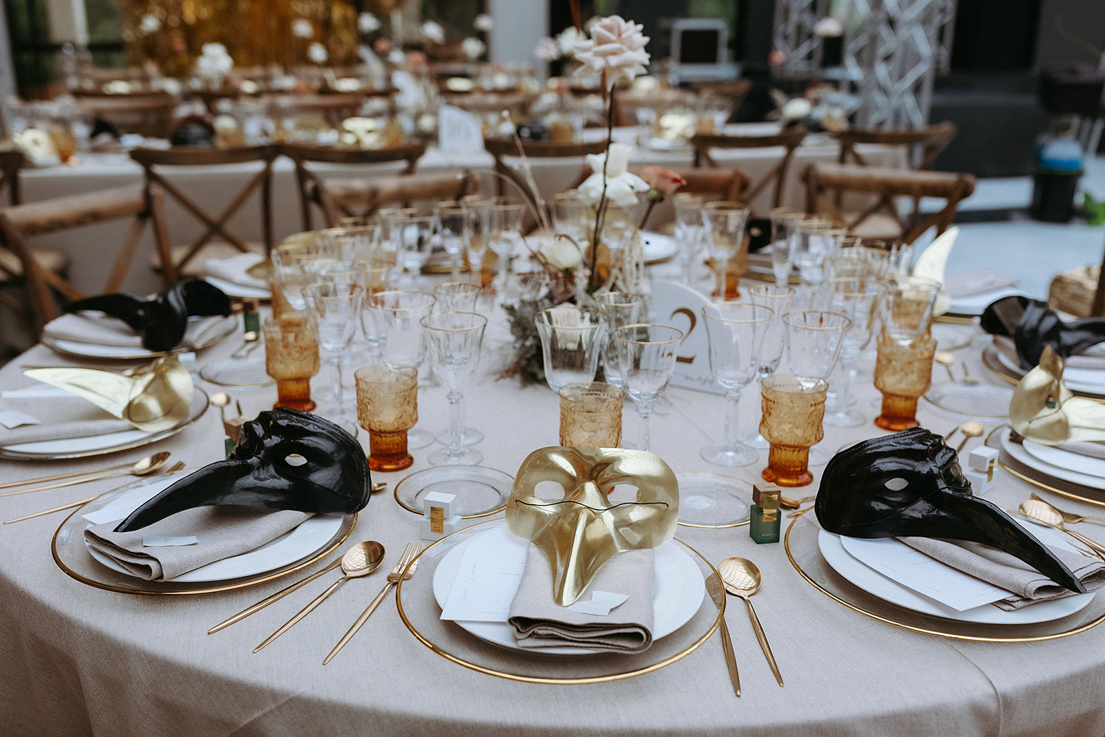 Flores y velas ocre, blancas y anaranjadas culminan el romanticismo que luce la sala en contrapunto con la diversión cortesana que se esconde detrás de las máscaras color oro y negro brillante, repartidas curiosamente junto a los cubiertos de cada invitado.