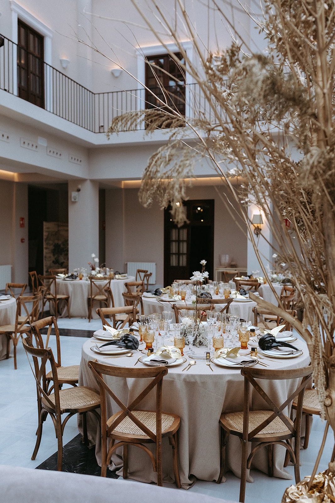 El mobiliario y decoración de Mafesa forma parte de esta boda en el precioso patio cubierto de Finca Ronesa en el interior de Alicante