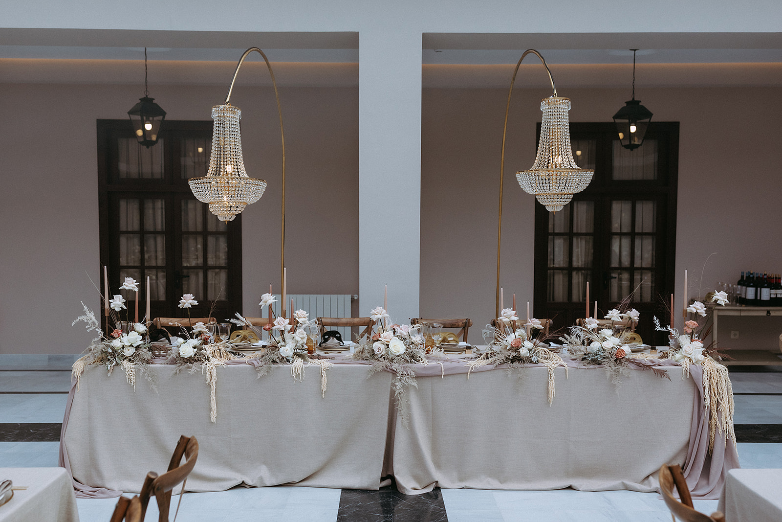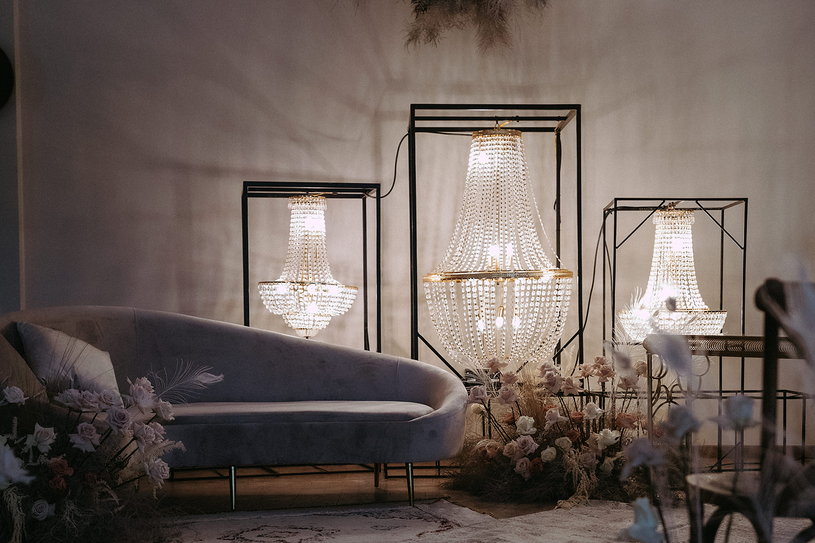 La elegante ceremonia de boda tiene como decoración protagonista un bodegón con lámparas de araña y el sofá de terciopelo Grey como altar para los novios. Las sillas Crossback son parte de la ceremonia con el fin de dar asiento a los invitados a la boda.