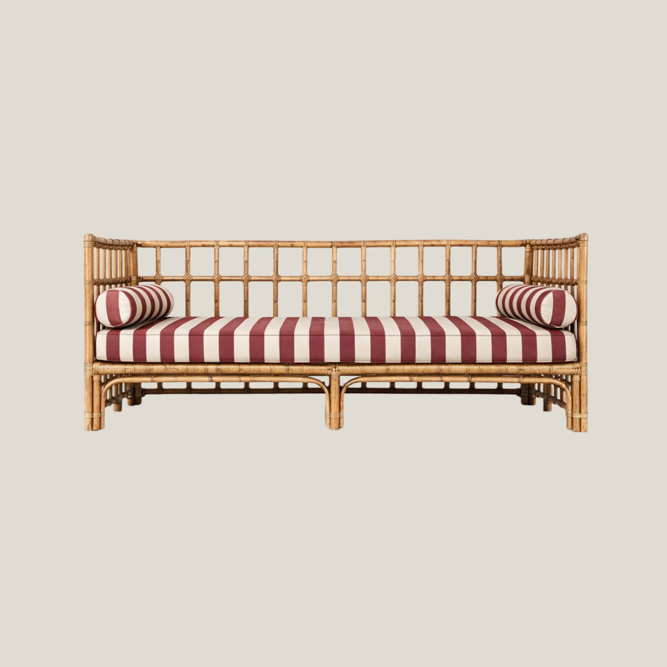 El sofá India de rayas rojas combina una estructura en fibras naturales con un asiento tapizado a rayas que aporta ritmo y contraste visual. Su diseño ligero y abierto lo convierte en una pieza versátil para zonas de descanso, aportando frescura y un carácter desenfadado pero cuidado.