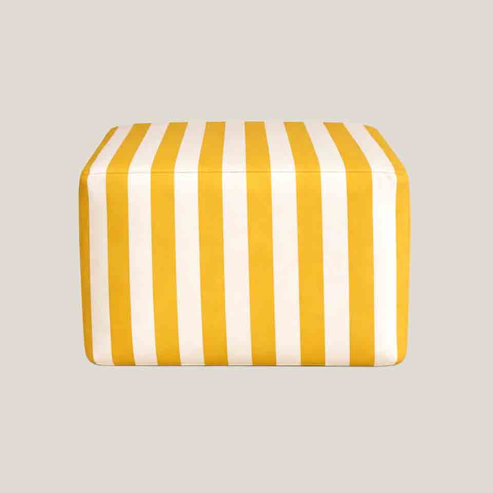 El taburete de rayas en tono amarillo introduce un ritmo visual dinámico gracias a su patrón a contraste. Su forma prismática y su tapizado lo convierten en una pieza funcional que, además de servir como asiento auxiliar, aporta luminosidad y un acento vibrante al espacio.